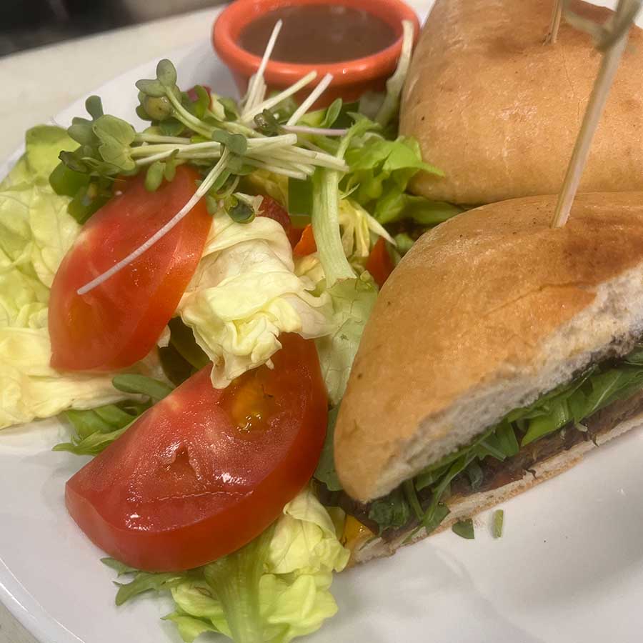 Grilled sandwich with tomatoes and greens, served at Cafe Catron Restaurant in Santa Fe.
